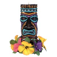 The Tiki Candle is made of wax in the shape of a Tiki God. These Tiki Candles are 8" tall and have a silk flower wreath around the bottom of the candle, making them nice centerpieces at a Luau party.